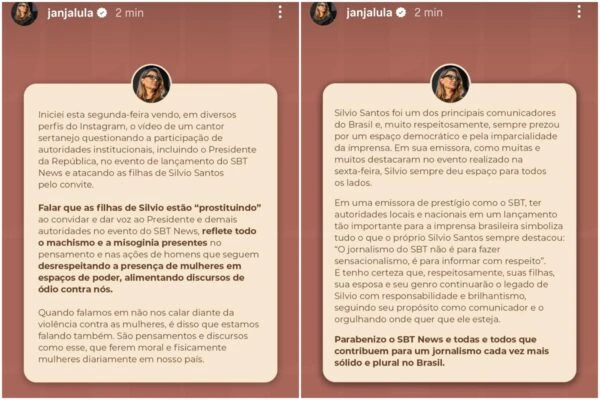 Para Janja, o tom usado por Zezé ao criticar a atual gestão da emissora passou de todos os limites. Em especial, quando ele afirmou que as filhas de Silvio Santos estariam “prostituindo” o canal ao abrir espaço para figuras políticas. A primeira-dama classificou a fala como misógina e carregada de machismo, algo que, segundo ela, ainda é muito comum quando mulheres ocupam posições de poder.