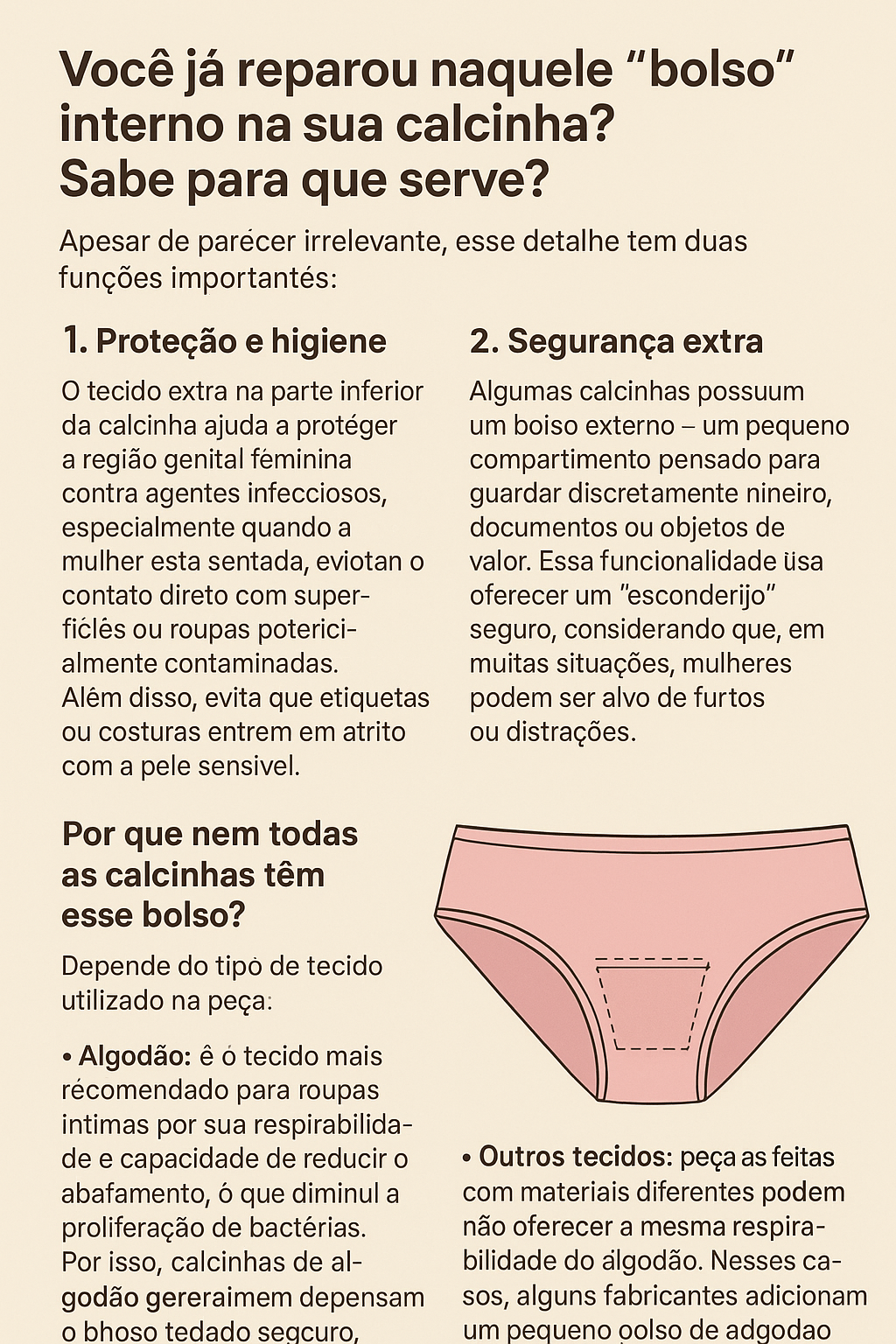 Você já reparou naquele “bolso” interno na sua calcinha? Sabe para que serve?